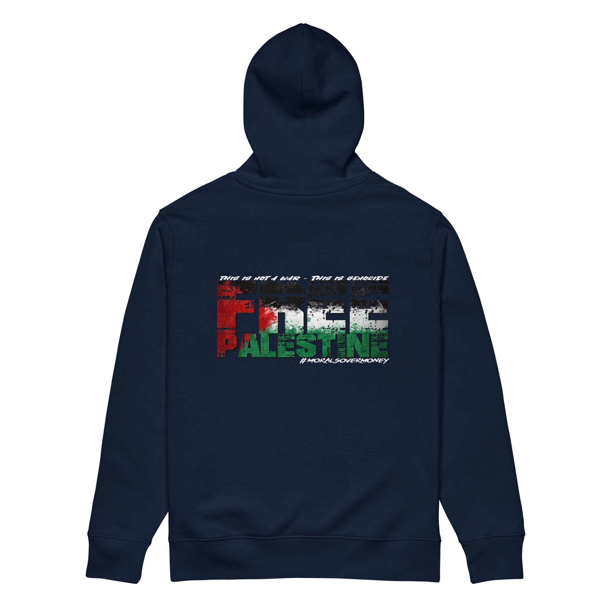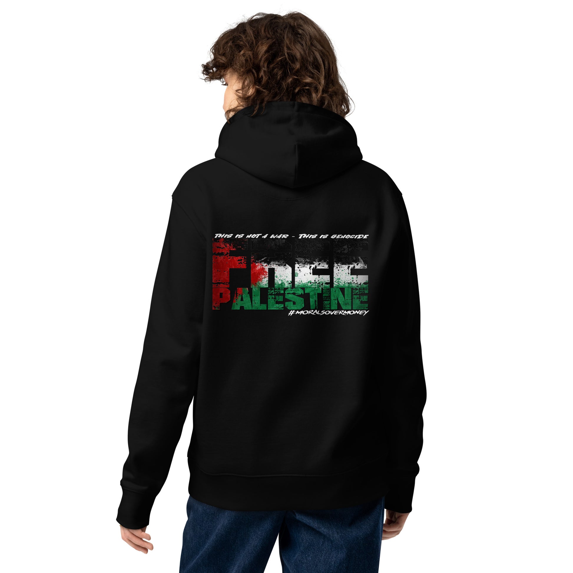 100% Organic Cotton Essentials 'Morals Over Money - Free Palestine' Eco hoodie - White Logo